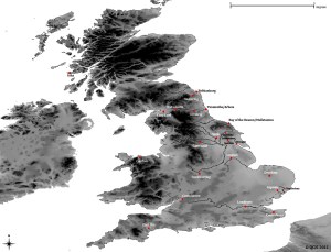 For the second map, a friend in New York worked her academic institution’s servers half to death to bring me a true projection of Great Britain, complete with relief features. I sent her the sketch map, and coordinates of anything that might be misconstrued (for example, Derventio–see below) and the names of the rivers I needed. She sent me this: