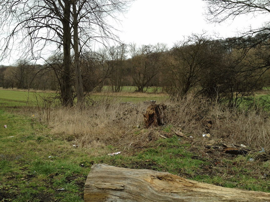 A few years later, many Great Events occur here–more specifically, at/in Cock Beck, which, as Hild observes in the novel, is like a fish weir for armies: funnel them into the gap between the beck and Becca Banks and pick them off at your leisure. It was mostly private land, though, so I couldn’t get down into it. I took this photo from the bridge over the beck (and edited out the rubbish in the water and the Private: Keep Out! notices nailed to the trees):