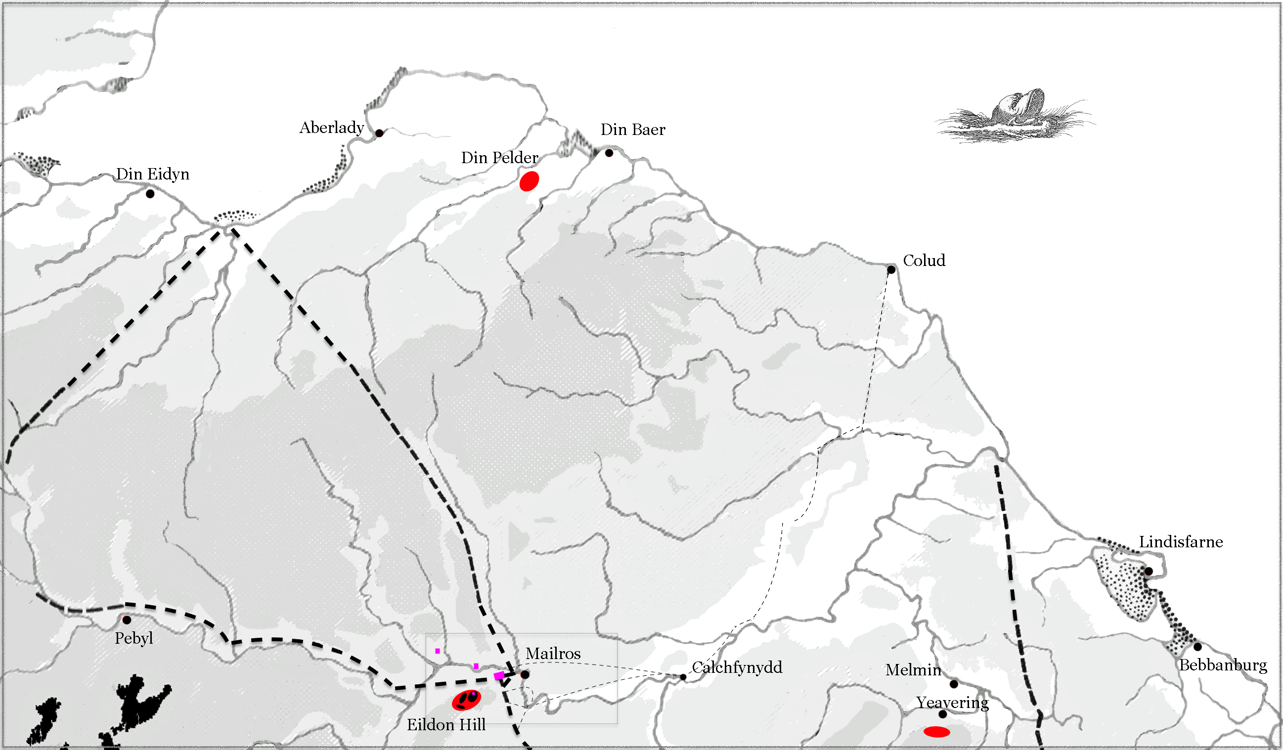 This is a map of the Tweed Valley—the part of Northumbria that the Gododdin think of as theirs (when they weren’t squabbling with the Manau Gododdin, their northern cousins)—as I imagined Hild might have experienced it. At some point I’ll update to software that can bend text and annotate it properly with all the river names. (For now, see this.) The red bits are hills with Iron Age strongholds. The heavy lines are Roman roads, the light Hild’s route, and the pink (from right to left) Roman fort, camp, and stones. I had to reverse engineer some of the names, e.g. Pebyl for Peebles, and Calchfynydd for Kelso. And I decided the Tweed, in Hild’s time, would have been the Twid.