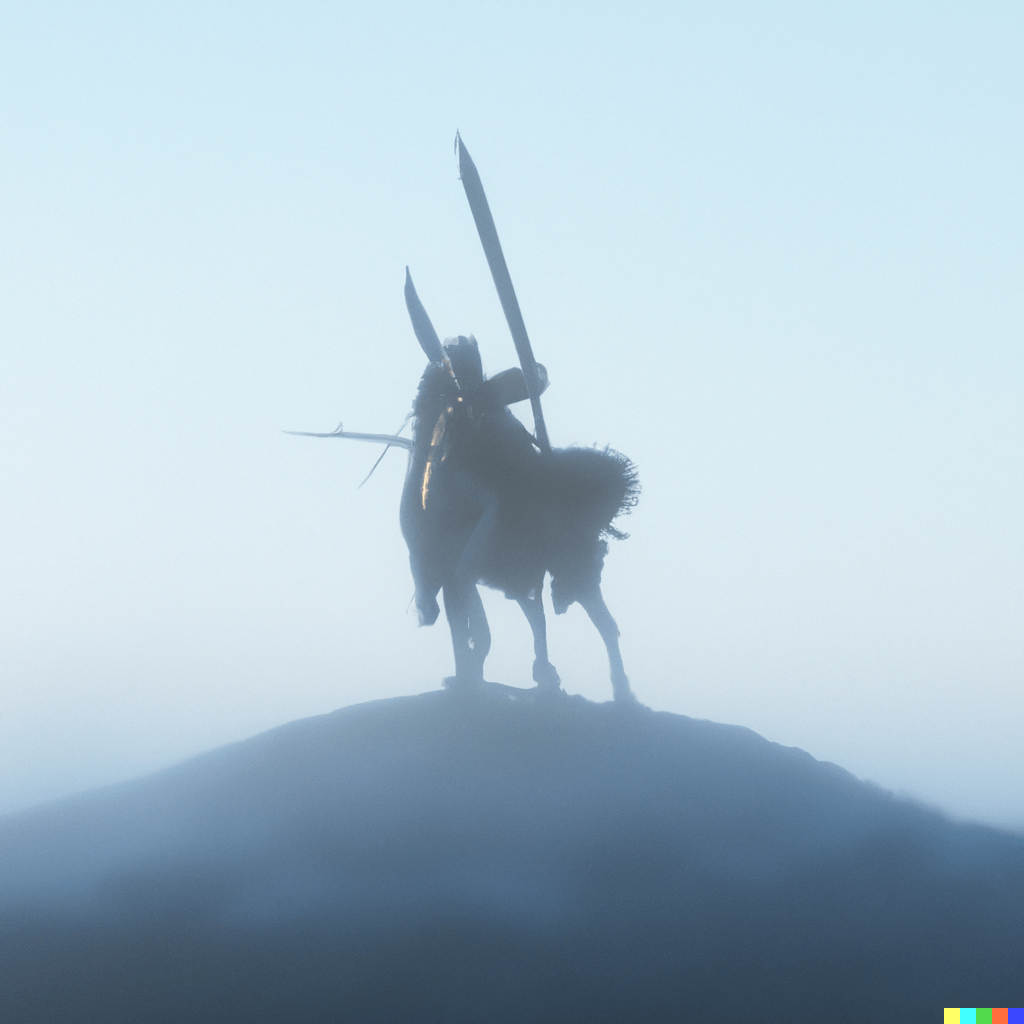 Having learnt from my experience with DALL-E, this time, when prompted, I typed in “Terrible formidable woman riding on horseback from the uncanny mist over the brow of a hill towards the viewer and hurling fearsome spears.” And got this: