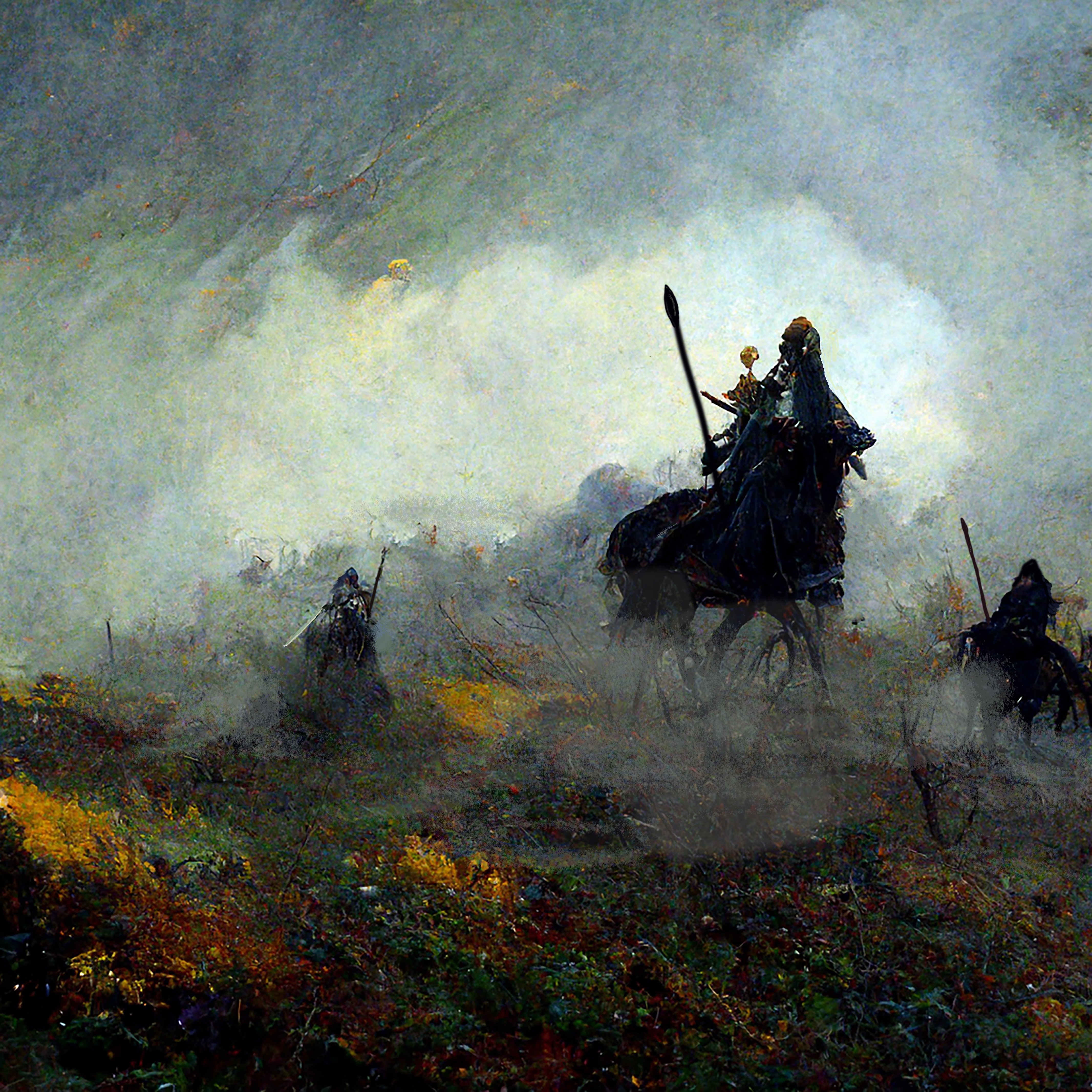 Having learnt from my experience with DALL-E, this time, when prompted, I typed in “Terrible formidable woman riding on horseback from the uncanny mist over the brow of a hill towards the viewer and hurling fearsome spears.” And got this: