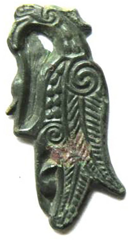 But what would the raven have looked like? Fortunately I’d already done some thinking about ravens. Given its similarity to a variety of 6th-century Merovingian and 6th- and 7th-century Anglisc finds, I suspect the Bamburgh raven was designed to be worn as a pin, oriented upright—and probably in pairs, which makes me think more of women’s clothing than men’s. But there’s one big difference between this raven and the other brooches—the legs and feet. The other brooch pairs have tiny sketches of feet, not these great complicated things that are sort of hard to tell where they begin and end. Also, those brooches do’t exactly shriek martial intent.