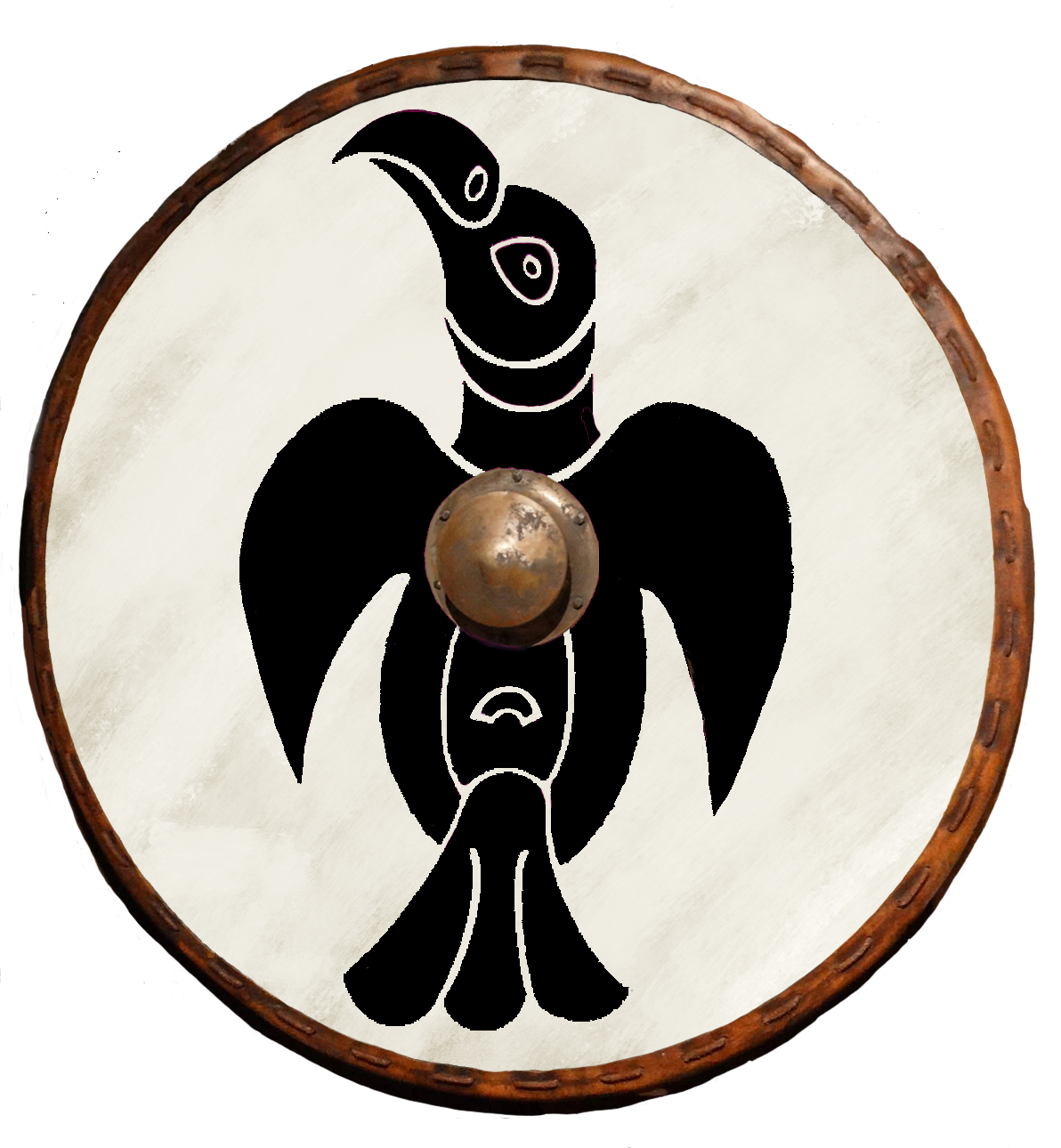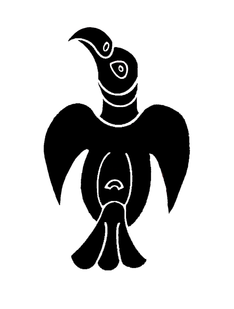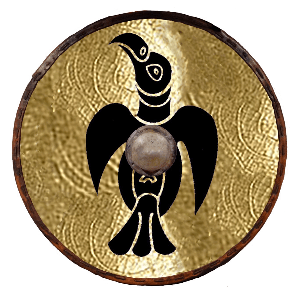 Creating Oswald’s totem was in some respects less challenging. For example, Bede says that after Oswald’s death, “to furnish a lasting memorial of the royal saint, they hung the king’s banner of purple and gold over his tomb.”4 Gold seems unambiguous. And purple I’d already decided.5 So that was the colours sorted. If we were talking of a later era, the banner might have been simple stripes, like the 8-stripe alternating purple and gold flag adopted by the first Earl of Northumberland, a complicated version of which is today the official flag of the county. But I was already committed to Anglisc animal totems. And of course there’s a clue in Oswald’s name: Os– meaning god and -wald ruler. Ruler of gods. And the ruler of the gods was Woden. Woden is cognate with Odin. And Odin had two ravens.6 (Later German legends of Oswald turn the saint and his talking raven into a comedy duo.) Given that Oswald was so prominently Christian, I’m not sure how much he would have emphasised his heathen-flavoured raven association—Bede certainly says nothing (except in connection with Paulinus’s preaching when Edwin was king). On the other hand, recent finds at Bamburgh Castle, Oswald’s stronghold of Bebbanburg, include a piece of jewellery that is interpreted as a raven: