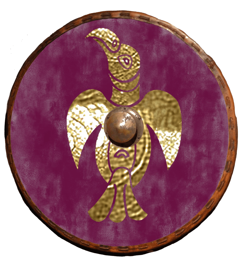 Shields are objects designed to be hacked to pieces. Actual gold is out of the question—except perhaps for ceremonial regalia. I think the same is true of purple; it’s just too expensive. There again, given the necessarily temporary nature of shield decoration the expensive, permanent colour could be swapped for cheaper, more fleeting pigments extracted from a mix of woad and madder, or bilberry, or whatever worked. For the great, rippling banner of the overking, though, I imagine a startlingly effective field of actual purple purpura5 embroidered in gold thread.