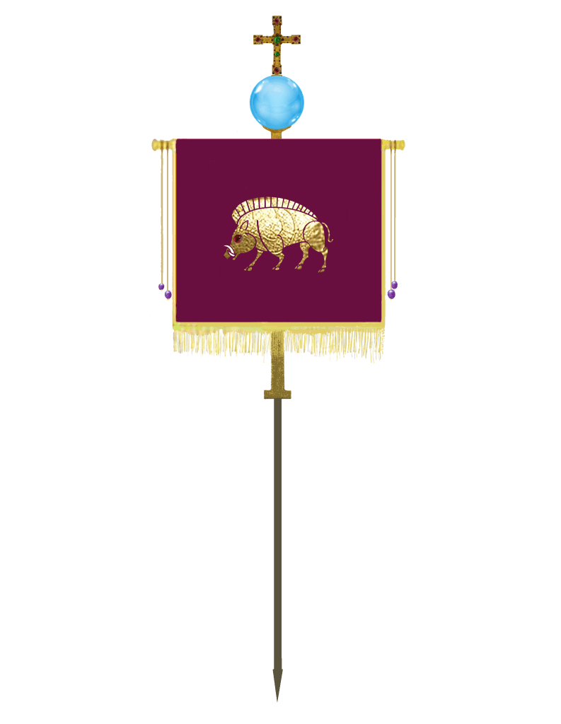 Edwin is descended from Yffi; he’s an Yffing. Working from admittedly very scanty hints, and because I just like the Benty Grange helmet, I decided he and his forebears used a boar as their totem on arms and armour—a suitably Anglisc and warlike symbol. But Edwin wanted to be admired for more than martial prowess. He wanted to be associated with Romanitas and thereby arrogate to himself the associational power of Rome’s majesty and might. Accordingly, in addition to the usual banners, flags, shields and so on, he also used a standard: