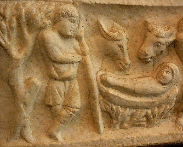 There is also, apparently, a fourth-century sarcophagus lid from the Roman catacombs (now in the Pio Cristiano collection of the Vatican Museums) carved with a series of now-iconic nativity moments: the magi bringing gifts, baby Jesus in his manger—this one a sort of hay basket complete with ox and ass and a shepherd. I can’t find a legally-usable image of that, though you can see it here. But I did find this one: